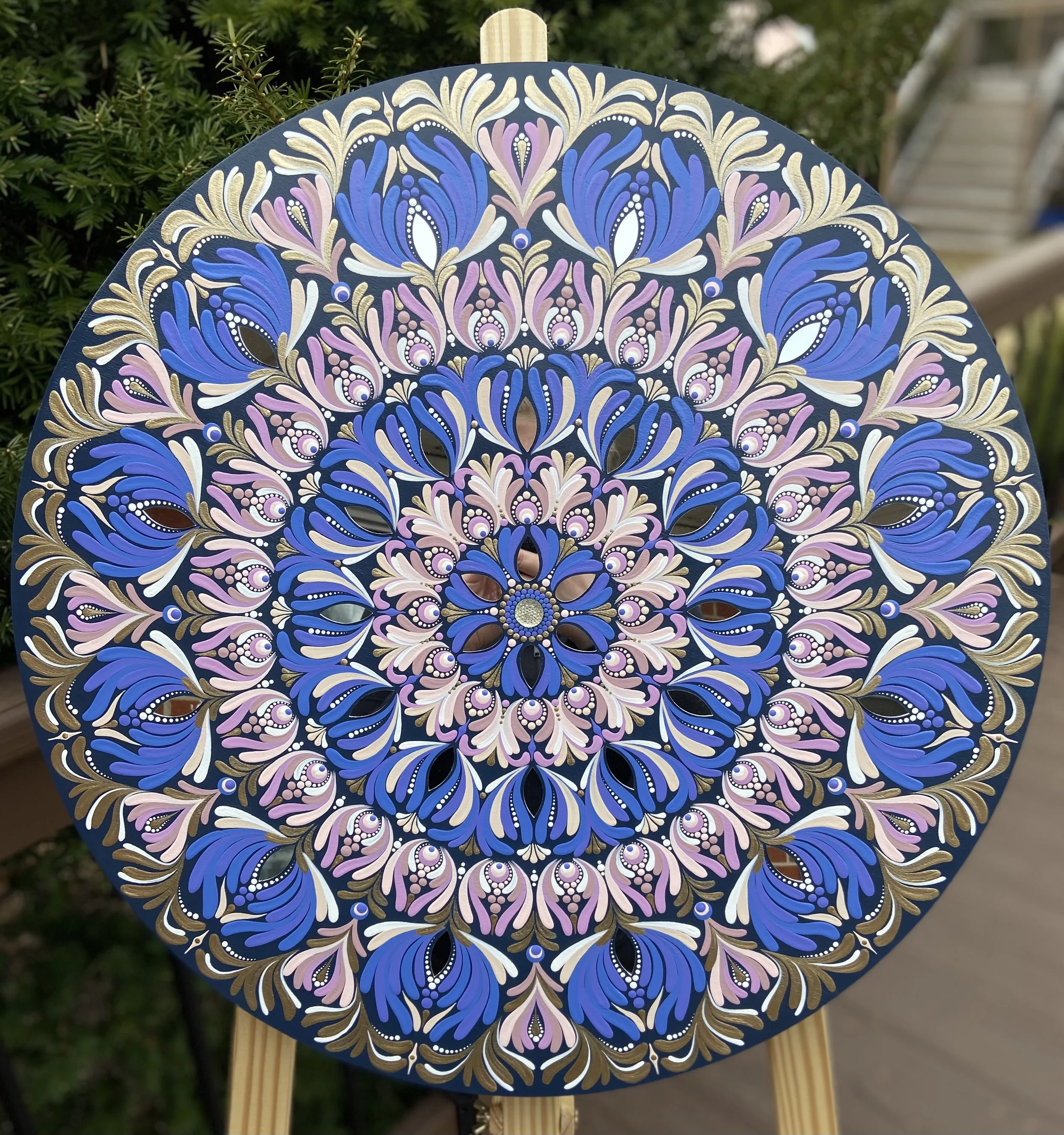 Image 1 of 1 22" Mandala $275.00 Hand painted on 1” thick birchwood using acrylic paint, mosaic mirror accents, sealed with satin topcoat. Add To Cart Added! Hand painted on 1” thick birchwood using acrylic paint, mosaic mirror accents, sealed with satin topcoat.