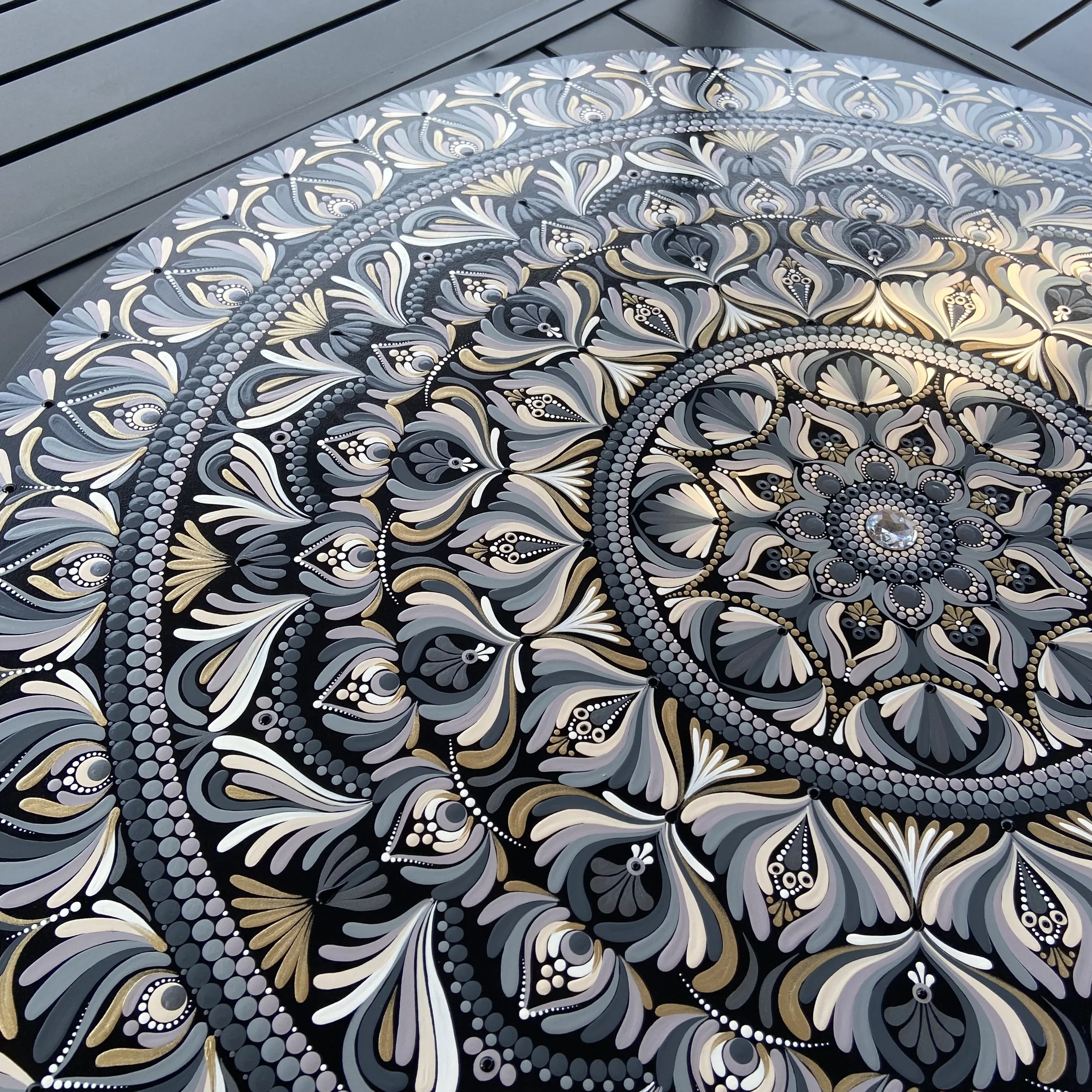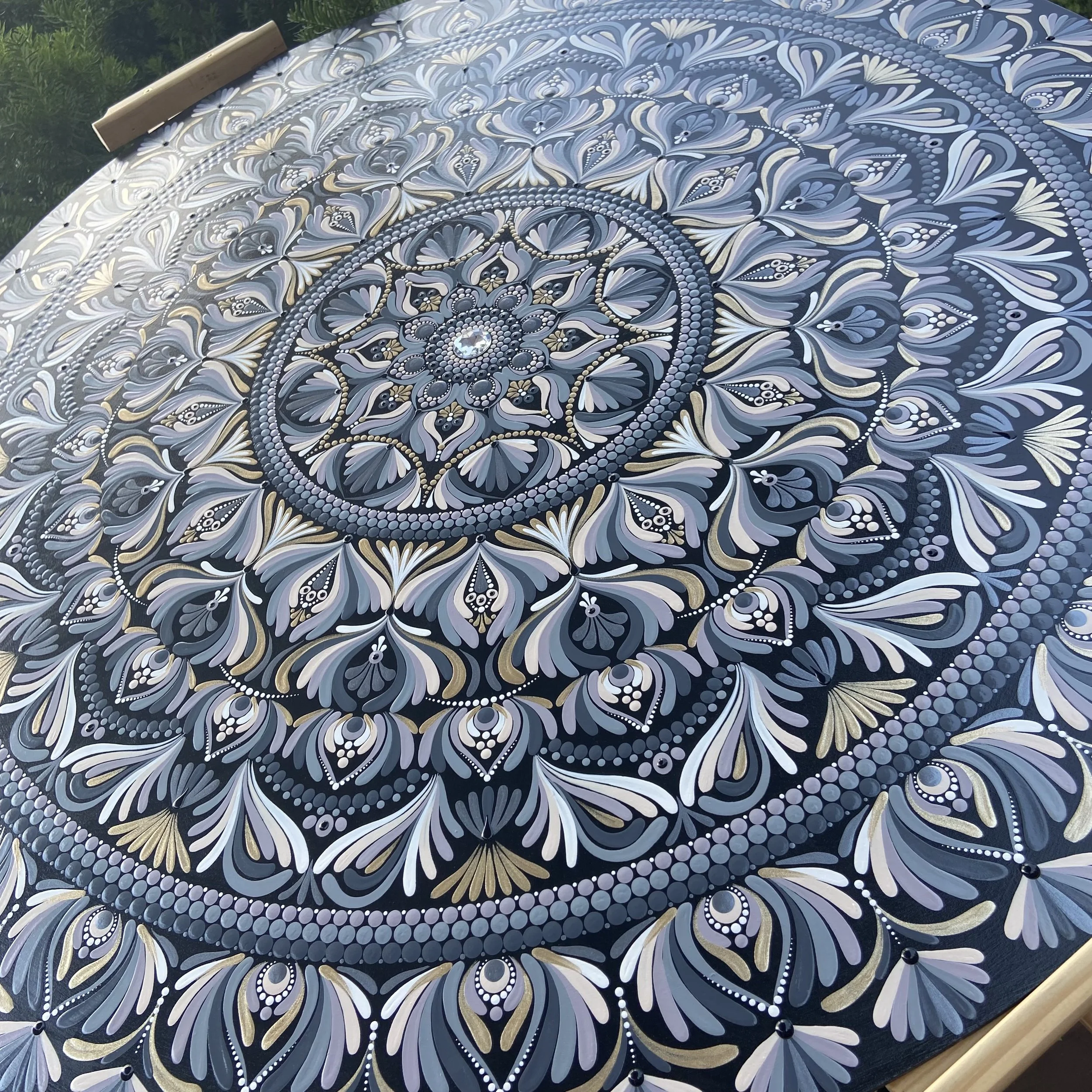Image 1 of 4 Image 2 of 4 Image 3 of 4 Image 4 of 4 36" Mandala $625.00 Hand painted on 1/4” thick mdf. Acrylic paint, sealed with satin topcoat. Hanging fixture attached to backside. Add To Cart Added! Hand painted on 1/4” thick mdf. Acrylic paint, sealed with satin topcoat. Hanging fixture attached to backside.